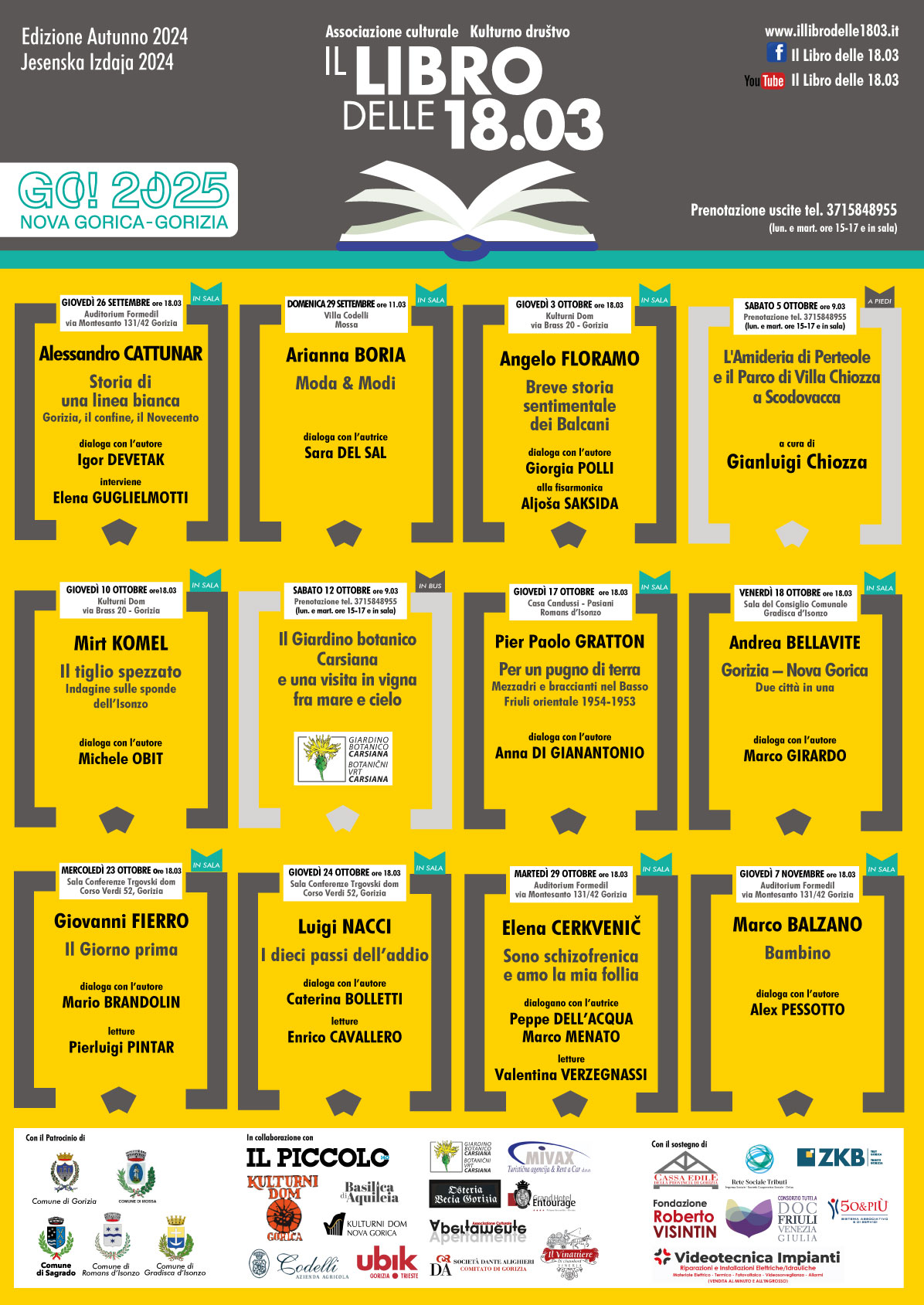 Anche la prossima rassegna de Il libro delle 18.03 – che si inaugurerà il 26 settembre a Gorizia all’Auditorium Formedil – proporrà un’ampia e variegata scelta di titoli: da “Storia di una linea bianca - Gorizia, il confine, il Novecento”, di Alessandro Cattunar a “Moda e modi – 1991-2021” di Arianna Boria, da “Breve storia sentimentale dei Balcani” di Angelo Floramo a “Il tiglio spezzato - Indagine sulle sponde dell’Isonzo” di Mirt Komel, da “Per un pugno di terra. Mezzadri e braccianti nel basso Friuli orientale: 1945-1953” di Pier Paolo Gratton a “Gorizia Nova Gorica. Due città in una” di Andrea Bellavite, da “Il giorno prima” di Giovanni Fierro a “I dieci passi dell’addio” di Luigi Nacci a “Sono schizofrenica e amo la mia follia” di Elena Cerkvenič, per concludere con “Bambino” di Marco Balzano il 7 novembre. A Gorizia le presentazioni saranno ospitate, oltre che da Formedil, dal Kulturni Dom e dal Trgovski Dom.